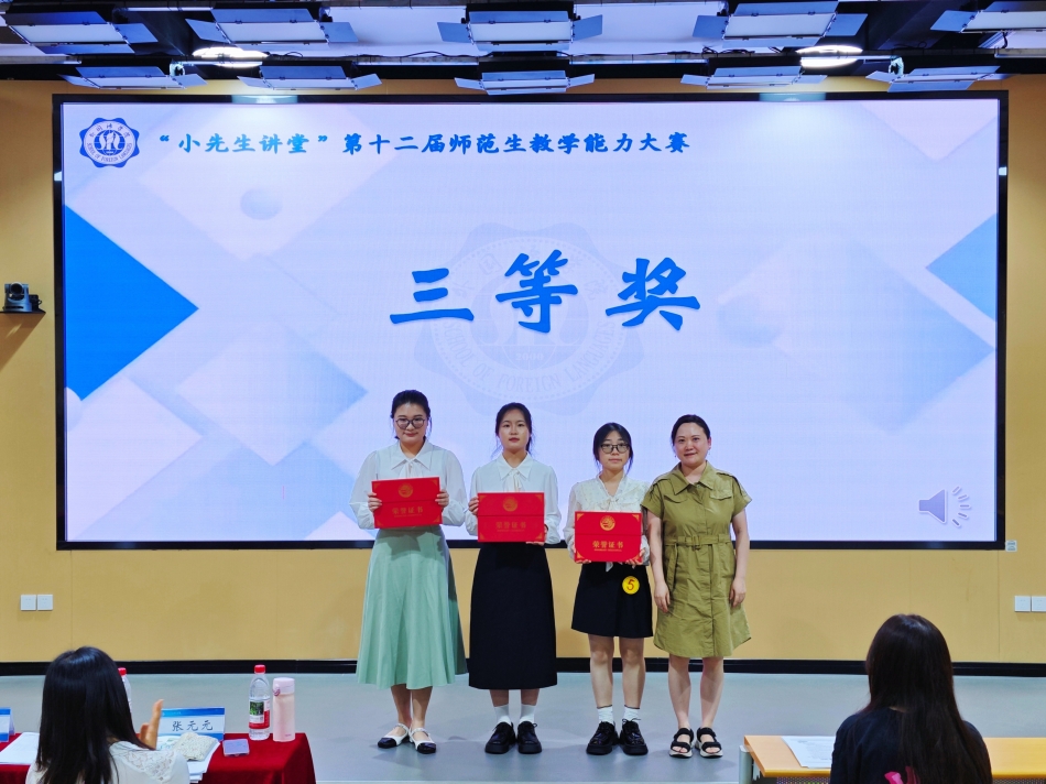 第二阶段为师范生教学能力大赛。经过层层选拔脱颖而出的十位选手展开激烈角逐,通过“说课、模拟授课、即兴演讲”三环节全面展示教学功底。说课环节,选手们展现了科学的教学设计理念;模拟授课中,通过生动多样的教学方法展现创新实践;即兴演讲展现了对教师职业的深刻理解与教育情怀。