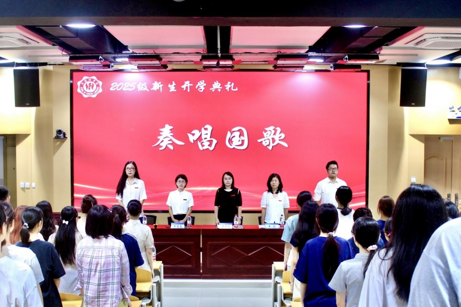 开学典礼在庄严的国歌声中拉开帷幕。全体与会人员肃立,高唱国歌,现场氛围庄严而热烈。
