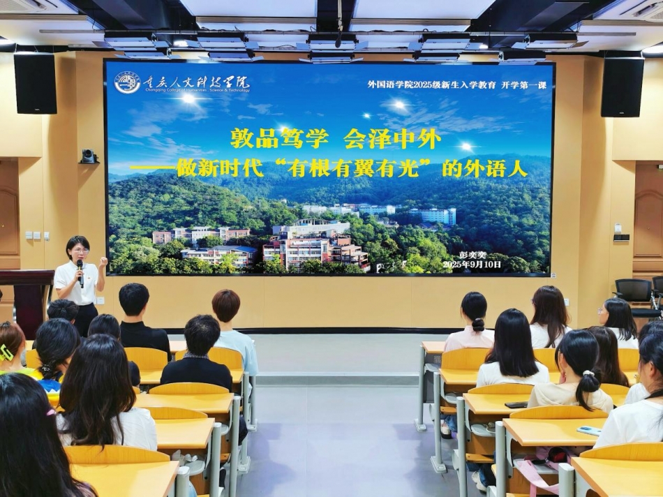开学典礼后,党总支书记彭奕奕为全体新生讲授题为“做新时代‘有根有翼有光’的外语人”的开学第一课。她从“时代之问”“校院之脉”“成长之路”三个方面深入阐述,结合英语专业的发展前景与人才培养目标,强调外语人才在国家发展中的重要作用,并勉励同学们树立正确价值观,提升专业素养与社会责任感,做有根基、有格局、有光芒的外语人。