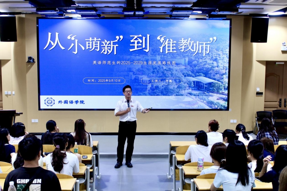 党总支副书记李巍以“从‘小萌新’到‘准教师’”为题,为新生带来生涯发展路径指导。他结合全国及重庆英语师范生就业现状,剖析行业竞争与发展机遇,提出教学力、研究力、连接力三类核心能力储备方向,并给出大一到大四的分阶段行动指南,鼓励新生以长远眼光规划生涯,逐梦教育领域。