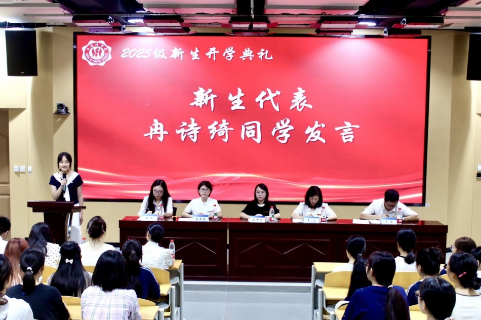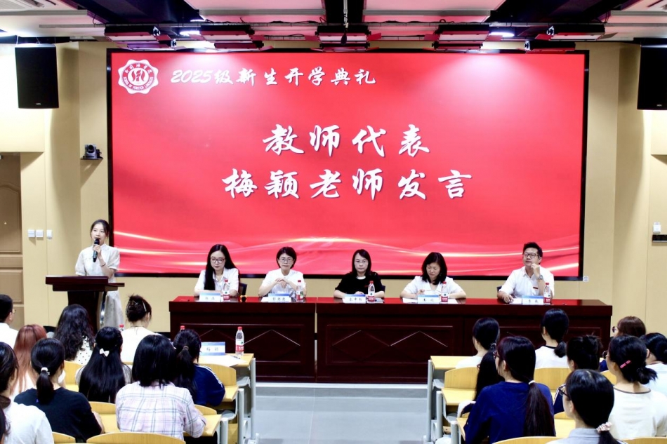 教师代表梅颖发言。她以“罗德岛的故事”为启发,勉励同学们立足当下、全力以赴,把每一次努力化为成长的跃升,并引用《红楼梦》中的思想意蕴,倡导保持求知欲与好奇心,以谦卑之心拥抱知识与世界,勇敢走出自我小天地,尊重并欣赏多元文化。梅颖希望新同学们在青春沃土上不断成长,在“小我”中成就“大我”。