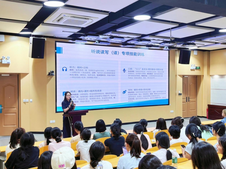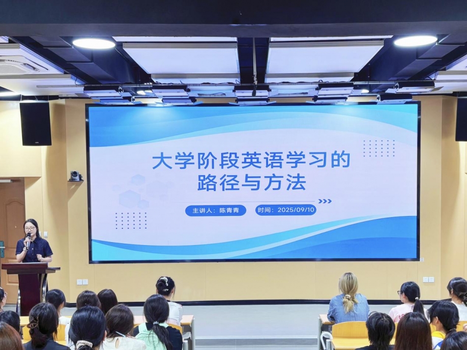 9月10号下午,陈青青以“大学阶段英语学习的路径与方法”为主题,重点讲解高中与大学英语学习的差异、专业价值认知、四年学业规划、具体学习方法及资源利用等内容,为同学们搭建了清晰的学业发展框架。讲座内容详实,指导性强,不仅帮助新生厘清了英语专业的学习思路,也让大家掌握了科学高效的学习方法和资源利用技巧。