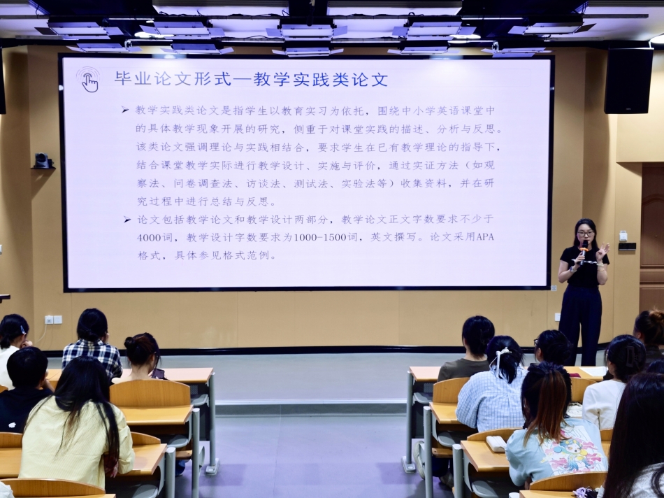 针对论文形式,陈老师介绍了学术论文、教学实践类论文、翻译实践报告三种类型,建议员工结合自身实习经历与个人兴趣等进行选择。在写作流程方面,她详细说明了选题、开题、撰写、答辩等各个环节,特别强调了AIGC检测与查重的要求。